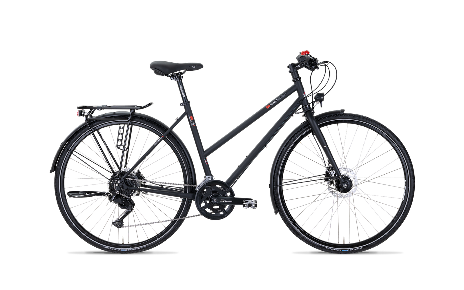 In der hier vorgestellten Sport-Version ist es als echter Allrounder mit einer bewährten 18-Gang-Shimano Cues Kettenschaltung sowie einer bewährt zuverlässigen Shimano Scheibenbremse ausgestattet. Natürlich bietet Ihnen das T-100 ein hohes Maß an Sicherheit, nicht zuletzt durch die beliebte Schwalbe Citizen Bereifung. Weiterhin sind der Busch & Müller-Scheinwerfer sowie das Rücklicht mit einer Standlichtfunktion ausgestattet, sodass Sie auch dann sichtbar bleiben, wenn Sie z. B. im Dunkeln an einer Ampel anhalten. Komfort für jeden Tag bietet ein besonders bequemer Sattel von Selle Royal.
